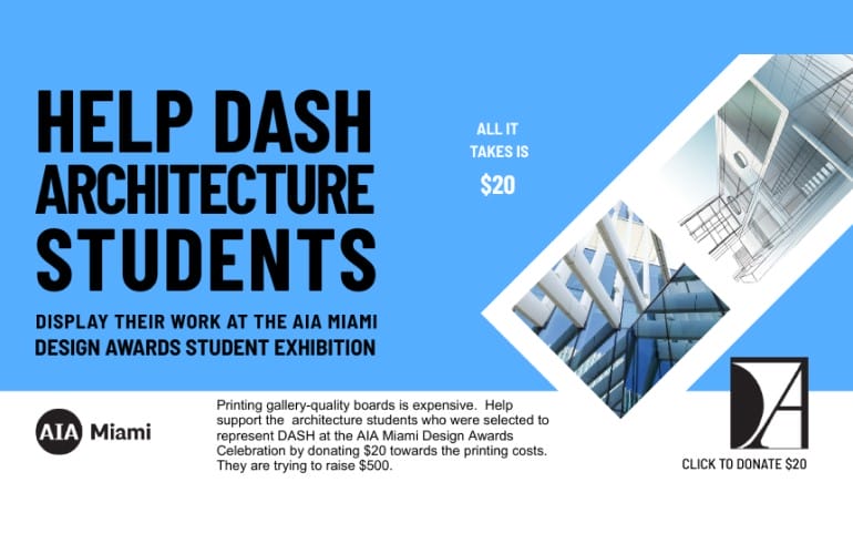 Help and Donate to DASH’s fundraiser, where the funds will be used to showcase their work at the Student Exhibition at the AIA Miami Design Awards Celebration.